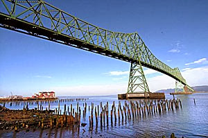 Today we crossed the Astoria bridge from Washington into Oregon. Days with a state crossing are always exciting but the Astoria bridge adds an extra frisson. It is 4 miles long with narrow lanes and no shoulder to hide in, so the car drivers either get VERY p*%^#^d off waiting behind you or decide to squeeze past. Neither is much fun. Just for good measure, in the middle of the bridge, there is a bloody great hill. Everyone survived and we then had a fun half hour in the bike shop replacing all the lightweight racing tires with something more suited to 1600 miles of riding in the gutter. You might wonder, as did I, why they didn’t fit these from the outset as recommended in the bumpf we sent out months ago ;-).