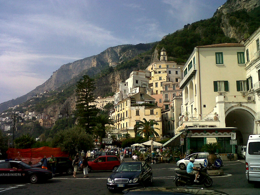 The run down into Amalfi must be one of the most stunning in the world. About 7 miles of hairpins which actually only carry you forward about 1 mile. As you drop you can see 4 or 5 loops below you with picture postcard houses clinging to the hill on either side. Far below is Amalfi with cruise liners in the harbour and the wakes of powerboats. It was fantastic.