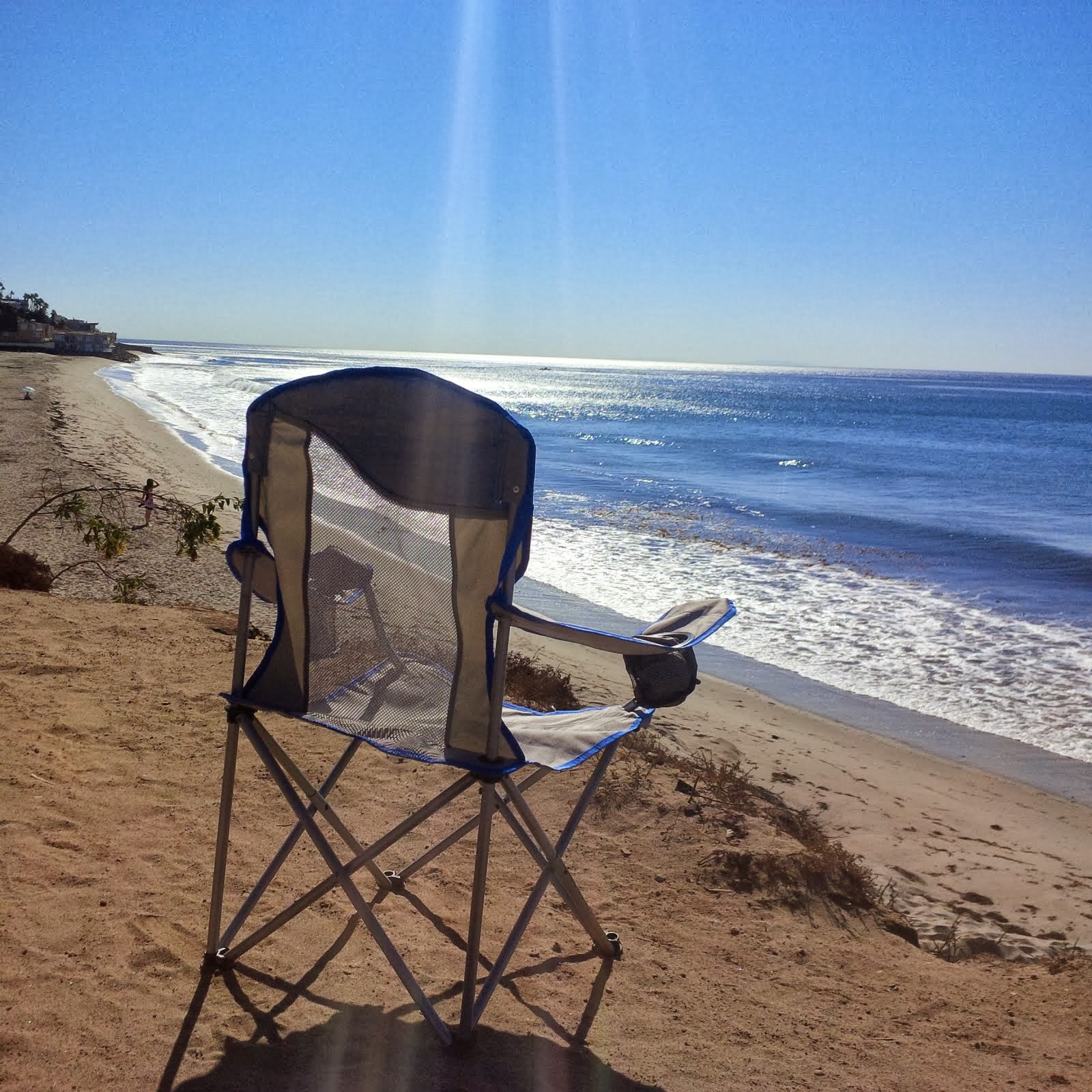 The photo is of my office for the morning – set up on the beach just north of Malibu. It was taken at 10:30….temperature 85 degrees!